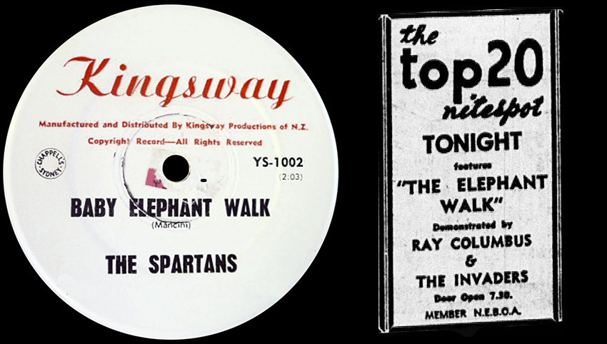 Main trunk line: Auckland group The Spartans release Henry Mancini's Baby Elephant Walk on Kingsway, while Ray Columbus and the Invaders introduce The Elephant Walk to the Top 20 dancefloor.