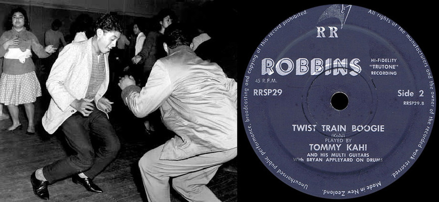 Dancers doing The Twist at the Māori Community Centre, 1962 (Ans Westra, Archives NZ, AAMK W3495/28H, CC 3.0); Tommy Kahi's Twist Train Boogie (Robbins, 1963)