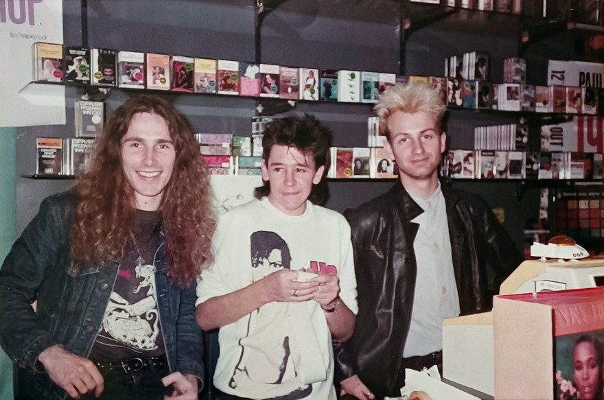 At the EMI Shop Downtown in 1985: Geoff Dunn, Roger Liddle (centre), manager of the store, and Adam Holt - Roger Liddle Collection