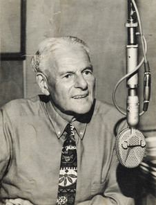 Cotton-Eyed Joe at the NZBC microphone, Wellington, c. 1970. His jazz show 'Rhythm on Record' ran for 40 years on the National Programme. - Pearce family