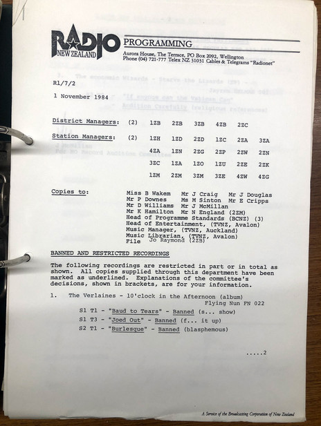 The F-word was identified as being “very clear” in The Verlaines’ ‘Joed Out’, from the 10 O’Clock In The Afternoon EP, which was banned along with two other tracks: ‘Baud To Tears’ (“he hasn’t got a s--- show … with a head full of crap”) and ‘Burlesque’, which was noted to be a “protest song” and “could be blasphemous”.