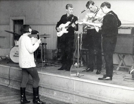Dinah Lee rehearsing with the Blue Diamonds in New Plymouth, 1964. From left: Bruce Lynch, Murray Coplestone, and Midge Marsden. - Bruce Lynch Collection