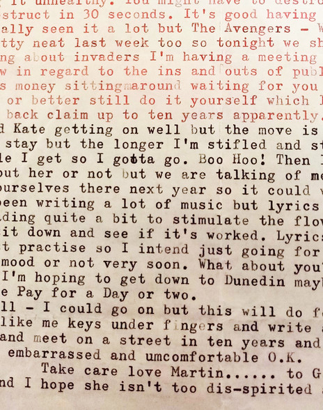 “It seems by your letter that you go to London to live. For how long? It disturbs me greatly. I just think it’s important to keep in contact with NZ. Like physically. It’s bad enough with you being in AK and out of touch with the landscape to some degree and out of touch with the original ideals of why you started playing music in the first place.