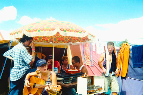 Festival-goers chilling at their campsite at Parachute Festival c.1997-98. - Alice Casserly