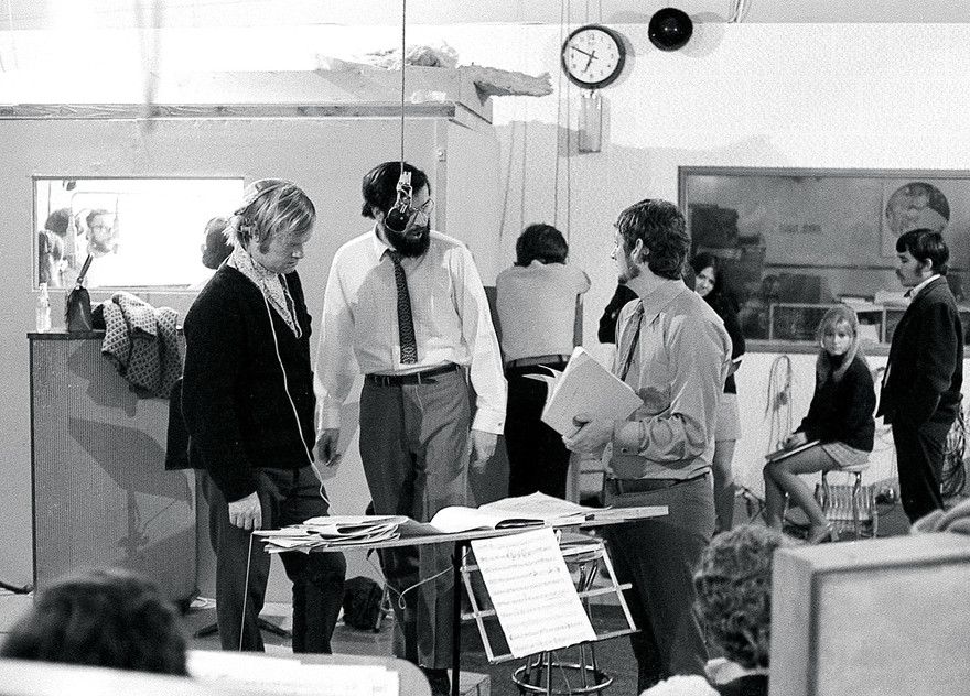 Happen Inn recording session at Mascot Studios, Auckland, September 1970. On the right-hand side, Suzanne looks towards the camera at her future husband, guitarist Bruce Lynch. In the centre are trombonist Neil McGough, musical director Bernie Allen, and vocal arranger Wayne Senior. The photo is by drummer, Bruce King.