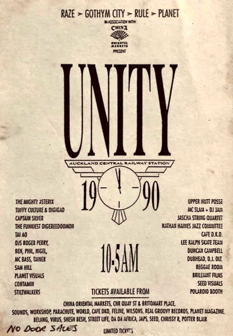 Unity poster, 1990. Amongst the promoters named, "Raze" refers to Roger Perry and "Planet" refers to Grant Fell.
