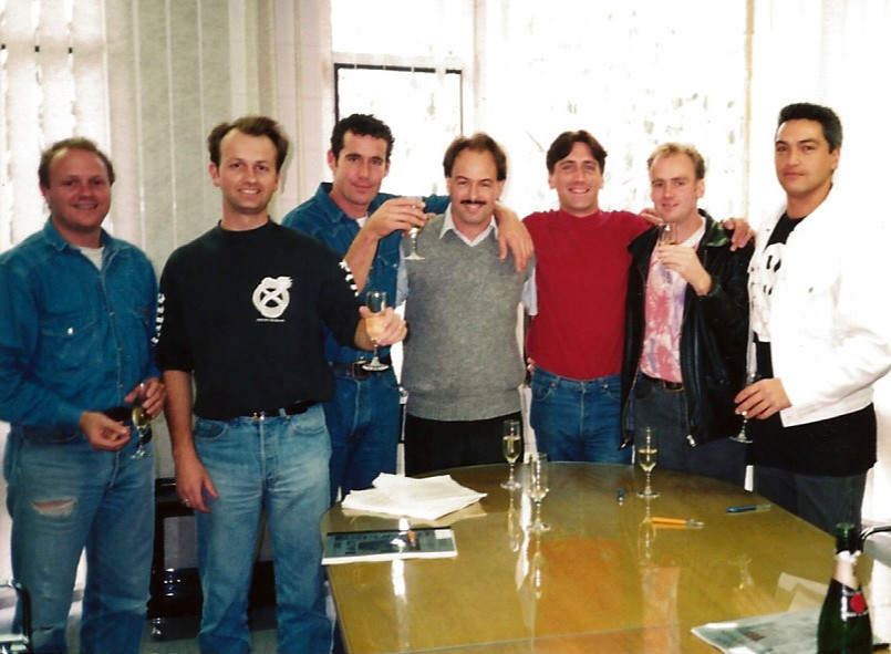 The Exponents signing to PolyGram in 1990. From left: Rodney Hewson (PolyGram), Adam Holt, Michael Harallambi, Grenville Turner, Jordan Luck, Brian Jones and Dave Gent - Adam Holt collection
