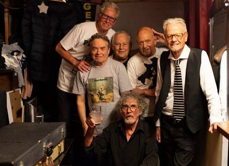 The Newz reunited, October 2025. At back: Simon Darke; in middle (L-R): Allan Catermole, Tony Rabbett, Brad Coates, Phil Jones; in front: Bryan Colechin