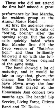 Nevin Topp closed his review of Talking Heads' 1979 Christchurch gig with these comments about the support band Bon Marche. - The Press, 5 June 1979