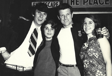 Mr Lee Grant with well-known Wellington radio DJ Neville 'Cham The Man' Chamberlain, with a couple of fans. Taken at The Place in Willis Street, owned by promoter Ken Cooper.