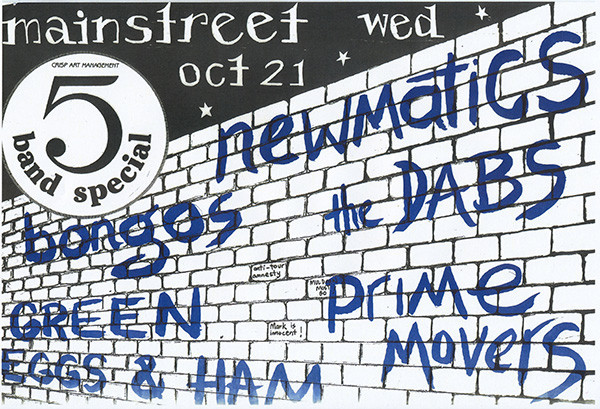 The bands that played Mainstreet reflected the fads and fashions of the era – the electronica of Car Crash Set, Herbs’ Pacific reggae, and the young pop bands signed to Simon Grigg’s Propeller Records, notably The Screaming Meemees, and a little later the Flying Nun bands.