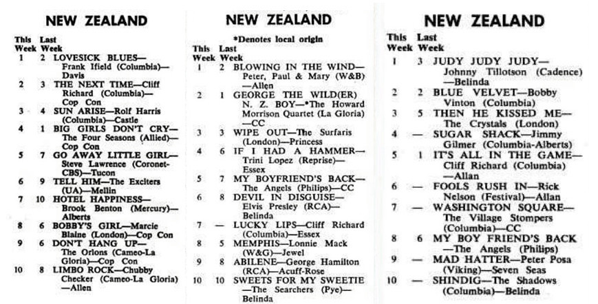 Three of the New Zealand charts compiled for Billboard by Fred Gebbie in 1963: 23 February, 26 October, 2 December