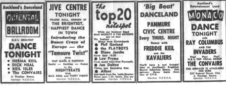 The lively Auckland club scene was spearheaded by an invasion of Christchurch’s top bands and performers. These were Max Merritt and The Meteors, followed by Ray Columbus and The Invaders, and Bobby Davis and The Wanderers. In April they were joined by The Playboys, who featured Diane Jacobs – aka Dinah Lee – and future folk singer Phil Garland.