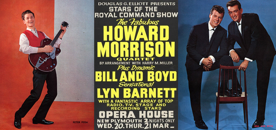 1963: Peter Posa; poster for the Stars of the Royal Command Show tour with Howard Morrison Quartet, Lyn Barnett, Kim Krueger, Bob Paris, Max Merritt and the Meteors; Bill and Boyd. The colour posters are from Playdate.