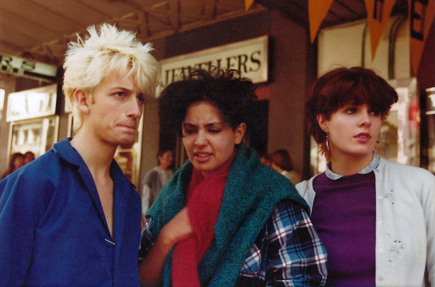 Adam Holt (in Travelodge uniform), Carolyn O’Neill and Charlotte Dawson, outside Mecca Café, Queen Street, 1982. - Adam Holt Collection