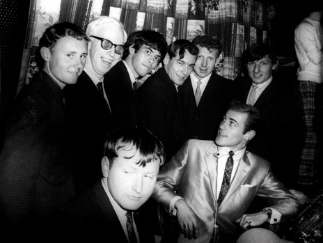 Johnny Douglas (back row, white hair), long-serving NZBC and RNZ music programmer, with the Gremlins and Peter Sinclair (front right).