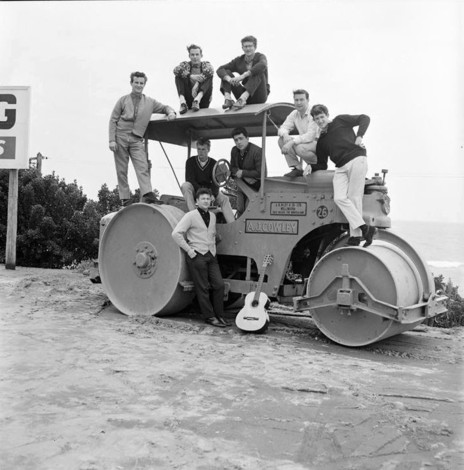 Bruce Lynch - at the steering wheel - with the Nite Lights, Taranaki, 2 December 1965. - Bernard Woods Studio; Puke Ariki, New Plymouth.