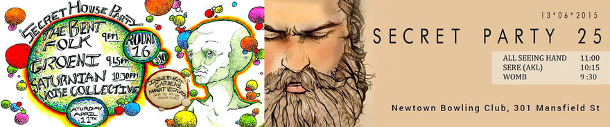 Secret house party posters from 2015. The first poster featured The Bent Folk, Groeni and Saturnian Noise Collective (AKL) performing at Innermost Gardens. The second poster featured All Seeing Hand, Sere (AKL) and Womb at Newtown Bowling Club.