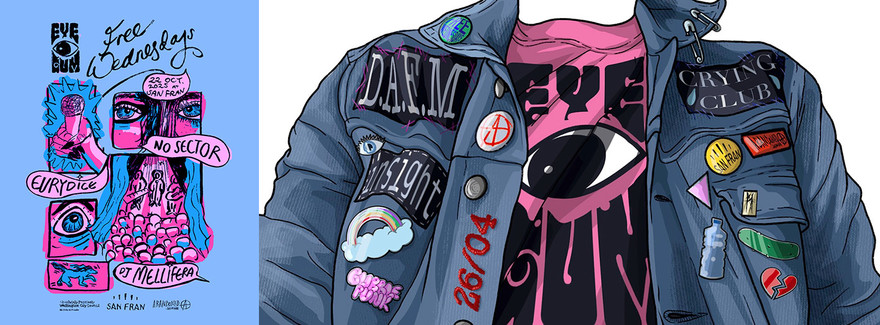 Eyegum Free Wednesday posters. Left: No Sector, Eurydice and DJ Mellifera, October 2025 (design by Sian Nelson.). Right: DAFM (Destroy All False Metal), Crying Club and Insight, April 2023 (design by Rae Nel).