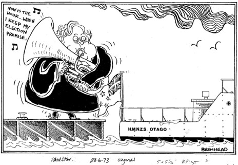 "Now is the hour … when I keep my election promise." Cartoon by Bromhead published in the Auckland Star, 28 May 1973. Peace Media sent the Fri and Spirit of Peace to Mururoa atoll with the objective of preventing the detonation of nuclear devices. The Labour government led by Norman Kirk sent the frigates Otago and Canterbury to observe.