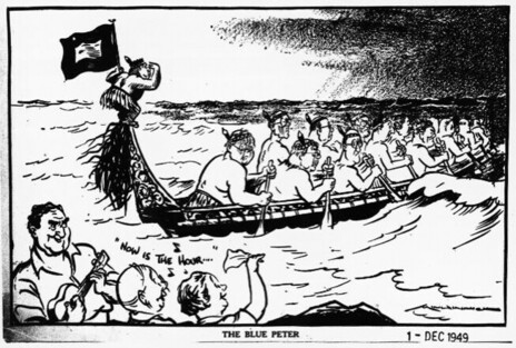 The NZ Herald's longtime cartoonist Gordon Minhinnick uses Now is the Hour to portray the departure of Peter Fraser's Labour government after the 1949 election. Farewelling them on the ukulele is incoming National PM Sidney Holland. - Allan Thomas Collection