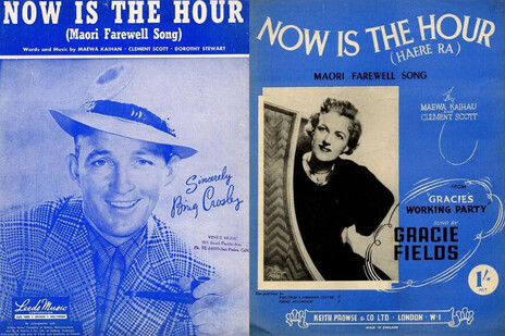 The major song in the early family of ‘Now is the Hour’ is ‘Haere Rā’, which possibly introduced the first English words. This allowed the song to be used at Pākehā farewells, as the earlier Māori text had facilitated its use at Māori gatherings. Poroporoaki (farewells) had been the occasion for the earlier songs and now the words of farewell were moved to prominence in the first line, “This is the hour for us to say goodbye.”