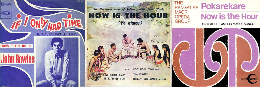Releases of Now is the Hour / Pō Atarau’ by John Rowles (France: Stateside, 1968), the Amorangi Boys of Rotorua (NZ: Kiwi, 1960), and the Rangatira Māori Opera Group (NZ: Salem, 1965).