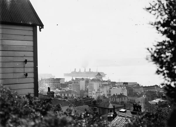 The troopship RMS Aquitania leaves Wellington Harbour, 1941. A year earlier, Māori Battalion soldier Ruru Karaitiana wrote 'Blue Smoke' while on board the Aquitania as it steamed towards Britain through the Indian Ocean. - Evening Post Collection, Alexander Turnbull Library, Wellington; ref 1/4-049250-G
