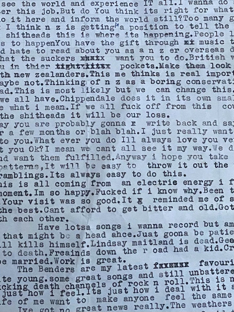 “It seems by your letter that you go to London to live. For how long? It disturbs me greatly. I just think it’s important to keep in contact with NZ. Like physically. It’s bad enough with you being in AK and out of touch with the landscape to some degree and out of touch with the original ideals of why you started playing music in the first place.