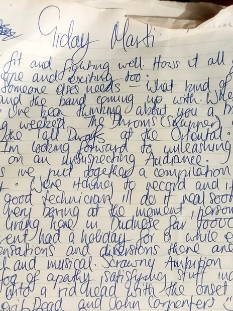 While on tour Martin Phillipps telephoned David Kilgour and wrote a postcard to him. David responded with a letter, updating him on the Dunedin scene including progress of his band, the yet-to-be-named Stephen.