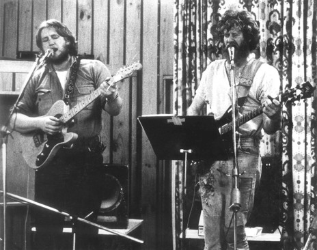 Dougal Speir and Jack “Bones” Lloyd-Jones at the Mangaweka's first gig at Victoria University, Wellington. The occasion was a Friday night beer hall, 1979. Not visible here are Malcolm Alder, bass, and Steve Garden, drums.